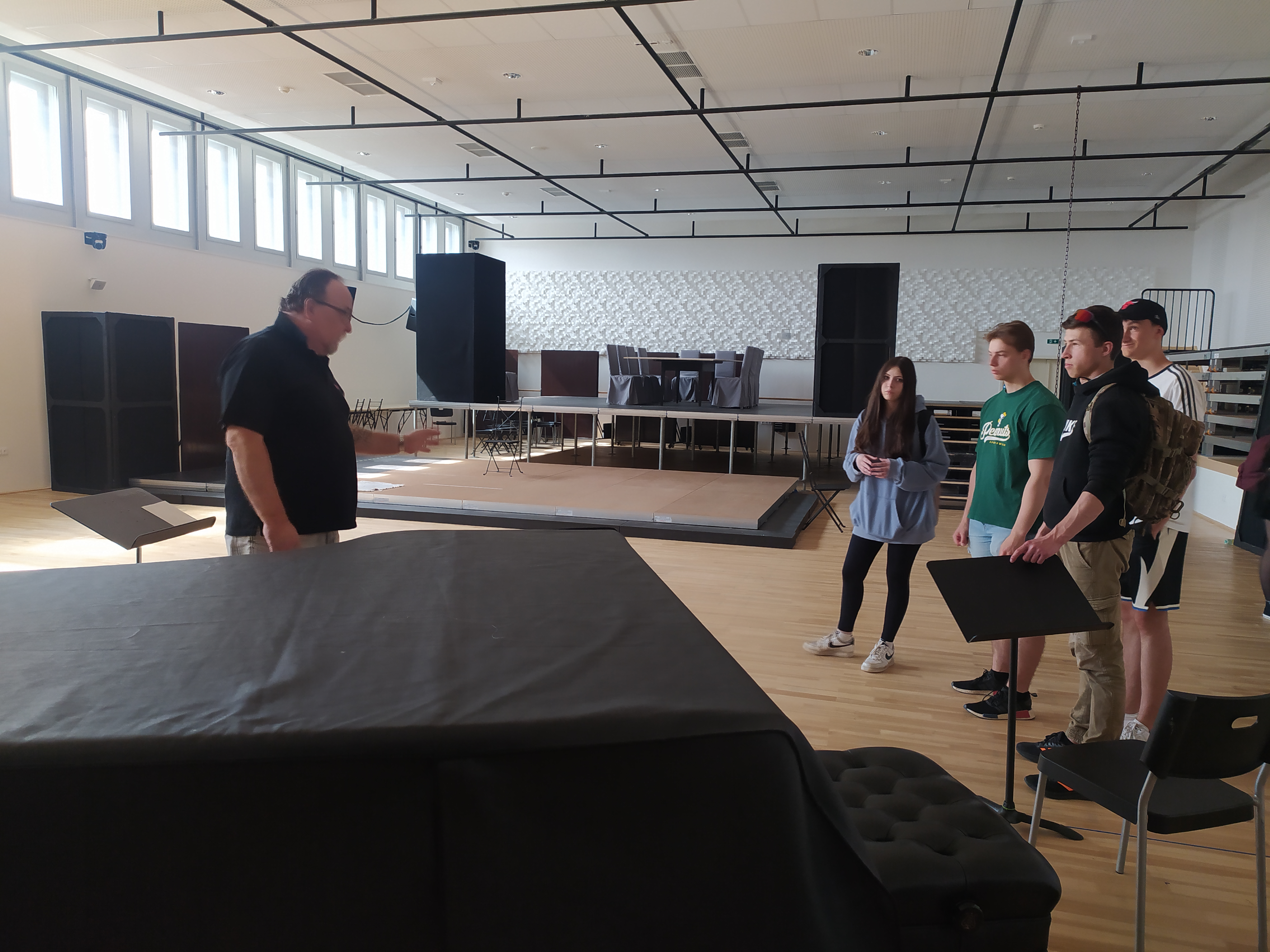 V pátek 26. 5. se studenti Estetické hudební výchovy z kvinty zúčastnili exkurze do zákulisních prostor Janáčkova divadla v Brně. Prohlídka začala u zaměstnaneckého vchodu, kde se studentů ujal vedoucí celé technické sekce pan Břečka. Ten velmi poutavě vyprávěl o všech důležitých místech, zařízeních i lidech, kteří v divadle pracují. Studenty provedl vstupním foyer, prezidentskou lóží, hlavním hledištěm, jevištěm, šatnami, zkušebnami a prohlídku zakončil u motorů a mechaniky hlavní jevištní točny. Ač se exkurze nesla v uvolněnějším duchu, přinesla studentům nové znalosti hlavně v oblasti provozu divadla a díky doplňujícím dotazům i řadu nových poznatků z technické oblasti.