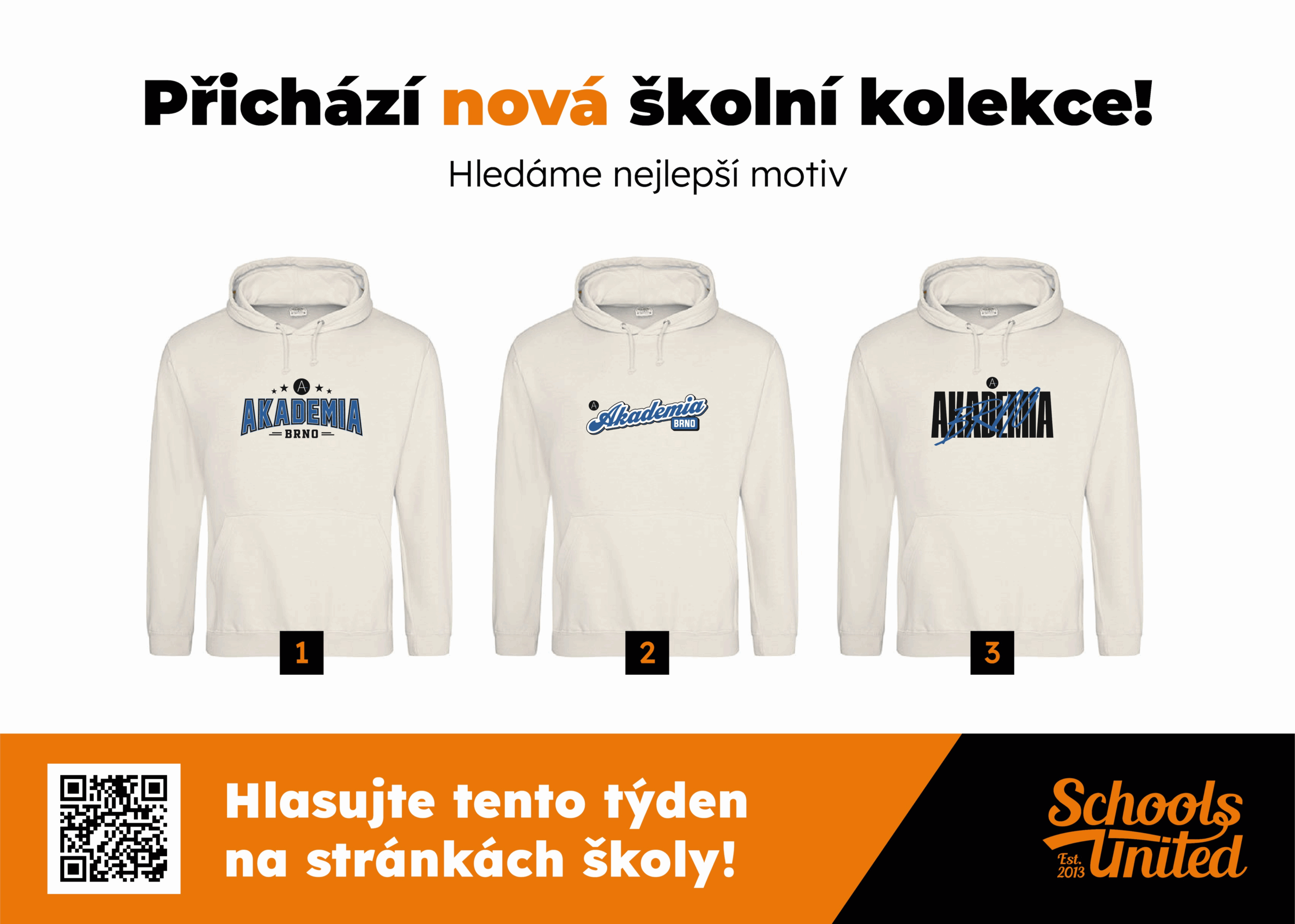 Ve spolupráci s firmou Schools United připravujeme nový školní merch! Do 25. 1. 2025 můžete hlasovat o podobě první kolekce zde: https://schoolsunited.cz/hlasovani/UO3NYHVI