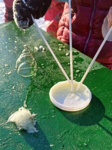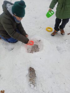 A kde je sníh, tam je samozřejmě spousta radosti! Děti se vyřádily při zimních hrách, sportech i při úplně obyčejném klouzání a dovádění. Nechybělo ani pozorování toho, jak mráz kouzlí – zkoumali jsme led, vodu i všechny proměny, které zima nabízí.